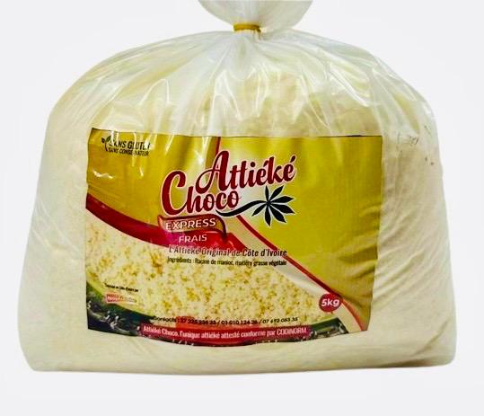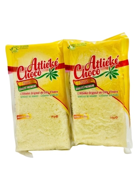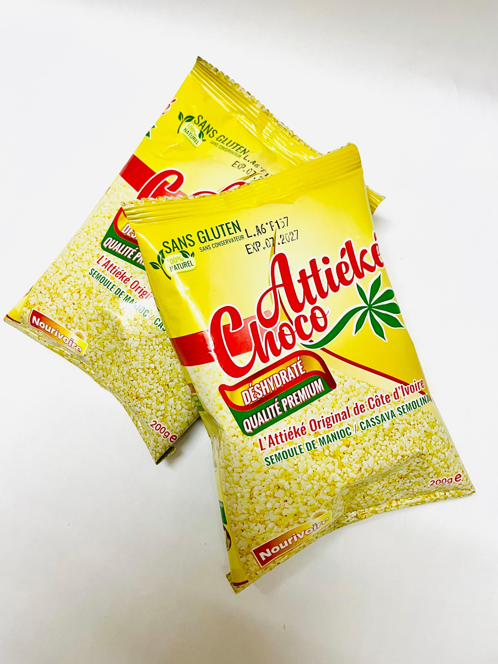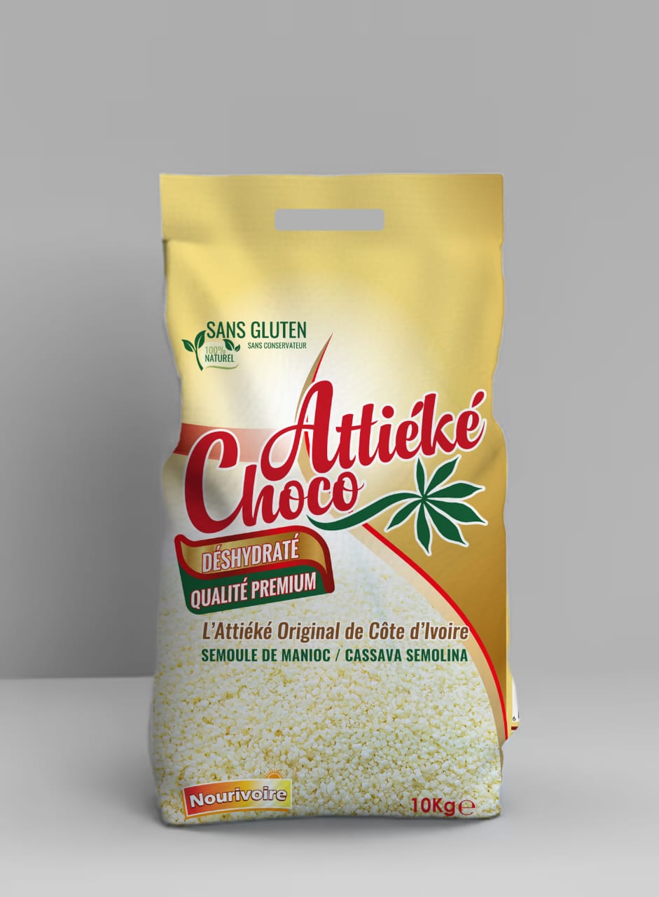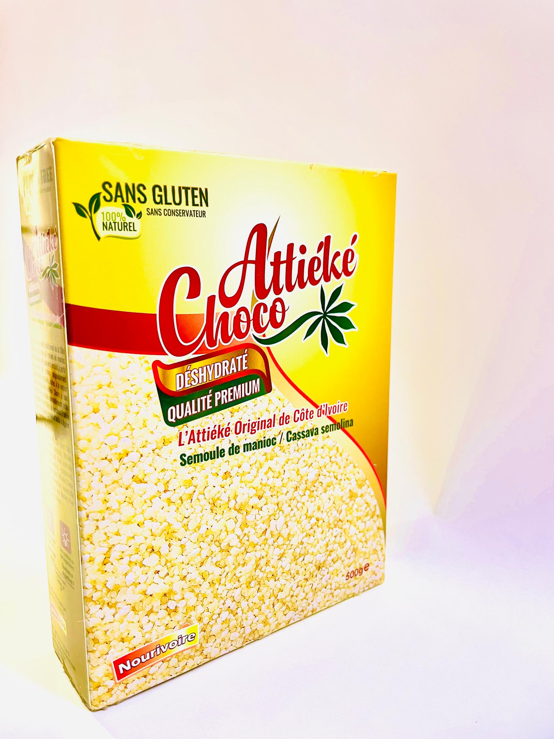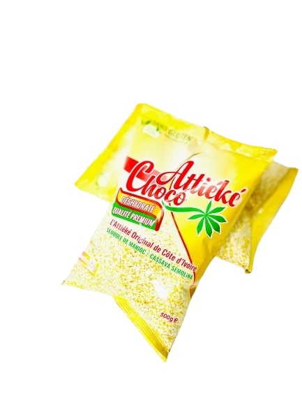 ATTIÉKÉ CHOCO est une semoule produite à partir de racines de manioc soigneusement sélectionnées, fermentées, granulées, puis cuites à la vapeur.